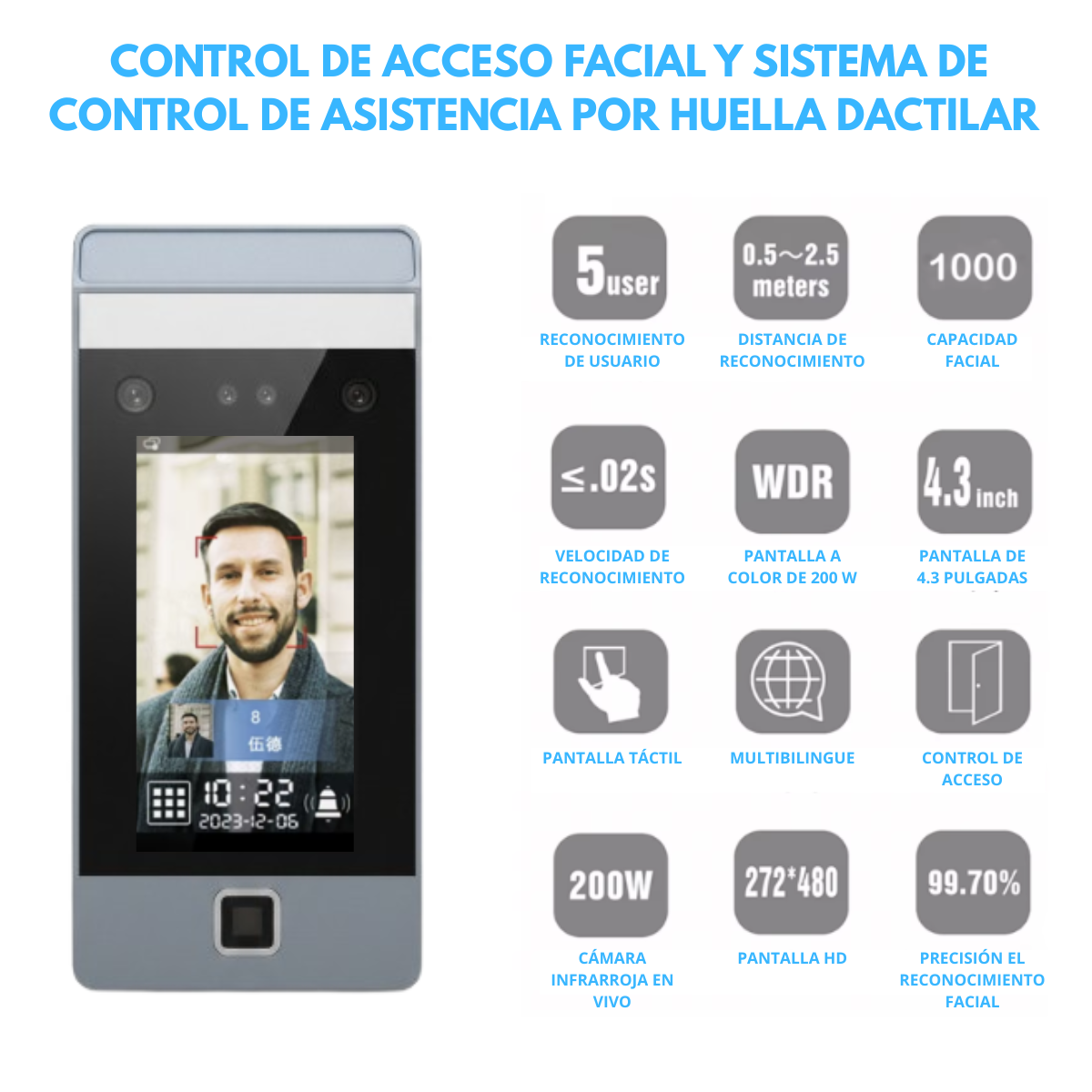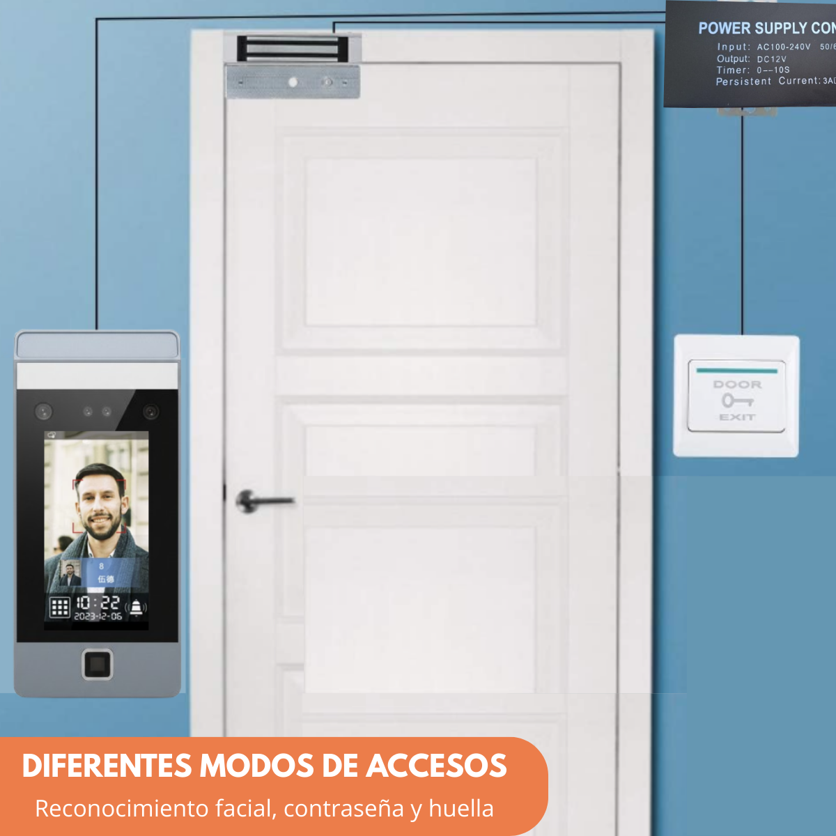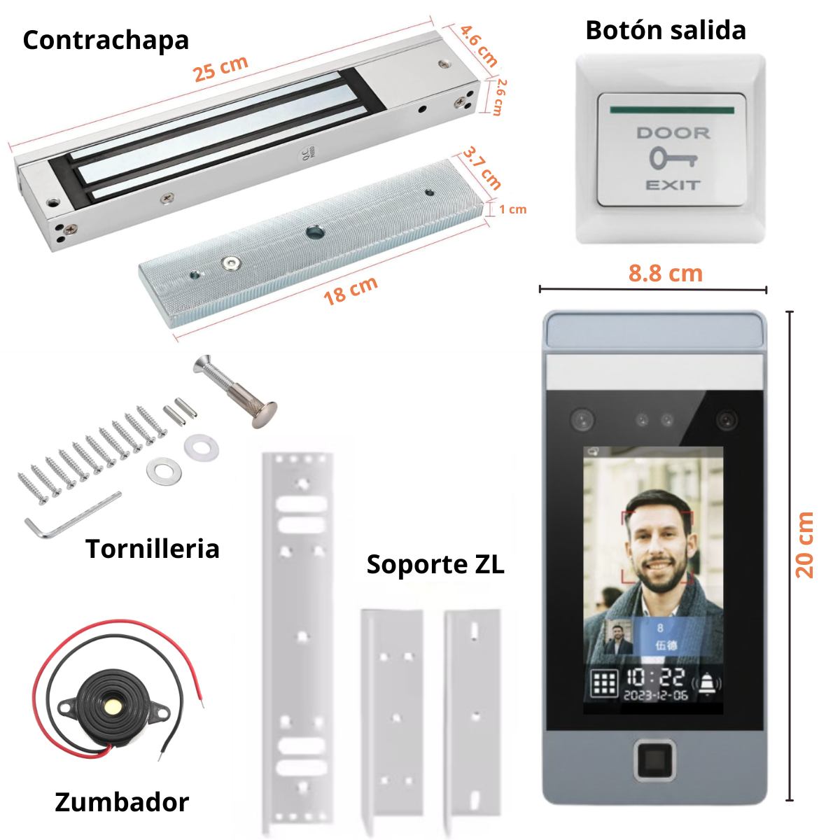 Todos los Registros: 200000 total INCLUYE: * 1 Terminal Biométrica T60: Pantalla a color y touch * 1 Fuente de Alimentación: Entrada 110V / Salida 12V (centraliza toda la energía). * 1 Soporte ZL : Estructura de aluminio reforzado para montaje de electroimán (uso opcional según el tipo de puerta). * 1 Botón de Salida: Para apertura interior. * 1 Buzzer de 12V: Para añlerta sonora Conoce nuestros demás productos que ofrecemos;