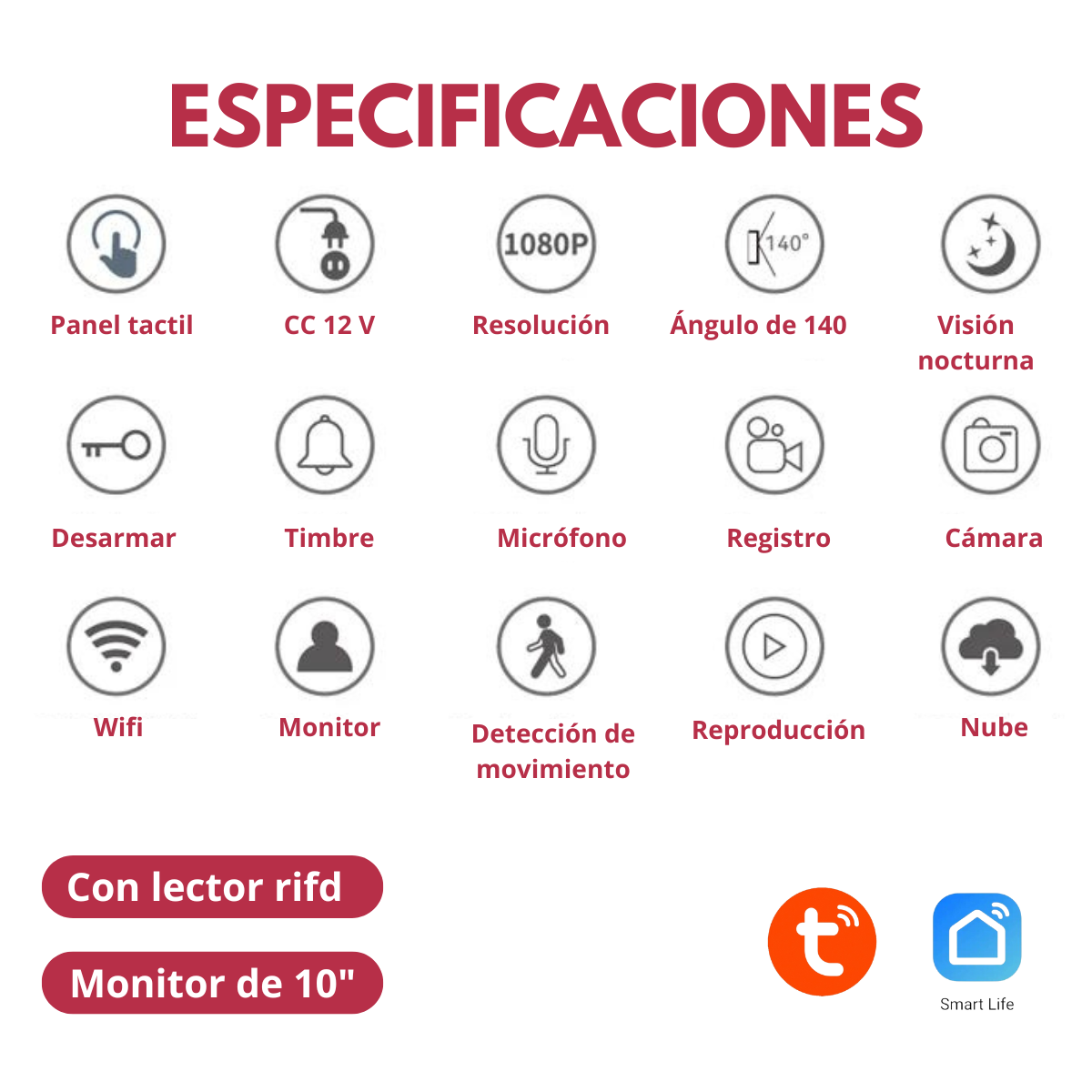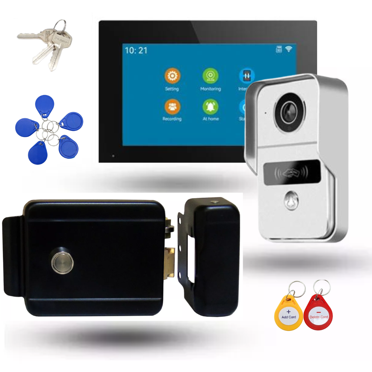 Este interfon video portero con lector de RIDF , WIFI y monitor de 10 pulgadas y chapa que trabaja con la App Smart life ó Tuya es ideal para mantener tu hogar seguro y conectado.